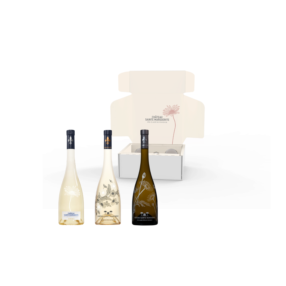 Ce coffret sélection de 3 bouteilles comprend : – 1 bouteille de Collection Marguerite blanc 75 cl – 1 bouteille de Fantastique blanc 75 cl – 1 bouteille de Symphonie blanc 75 cl Cet été, découvrez en édition limitée l’excellence de Château Sainte Marguerite avec ce coffret sélection de 3 bouteilles, soigneusement élaboré pour les amateurs de blanc. Chacune de nos cuvées est le fruit et le reflet de notre savoir-faire et notre passion. *Appellation Côtes-de-Provence contrôlée